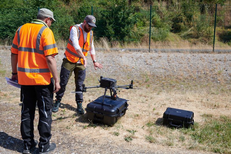 Aus diesem Grunde wurden in Kooperation durch die Frankfurt University of Applied Sciences 2 Drohnen samt hochauflösenden Kameras eingesetzt, welche das Projektgebiet mehrfach überflogen und sehr viele Fotos mit 1cm Bodenauflösung generierten. Unter Bäumen und andere kritische Bereiche erfasste man am Erdboden mittels 2 statischen Laserscannern durch dutzende Aufstellungen hochauflösend. Somit konnte der gesamte Bereich an einem Tag detailliert vermessen werden. Neben Echtzeit-Satelliten-Positionierung (RTK) wurden über 20 vorab fest markierte Kontrollpunkte zur Verknüpfung und Überprüfung aller Messdaten der verschiedenen Aufnahmesysteme verwendet.